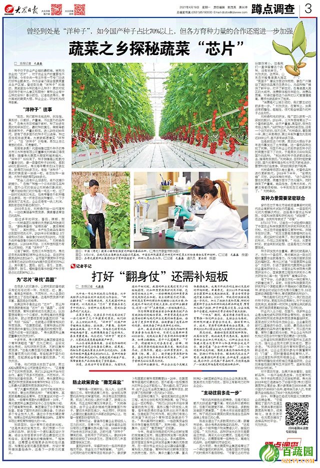 記者了解到,包括三木種苗在內(nèi),壽光近年來共培育起7家種業(yè)龍頭企業(yè),自主研發(fā)蔬菜品種達(dá)到140個(gè),全市國(guó)產(chǎn)蔬菜種子市場(chǎng)占有率已由2010年的54%提升到目前的70%以上,其中黃瓜、圓茄、絲瓜、苦瓜、豆類、西葫蘆、甜瓜、櫻桃番茄等作物國(guó)產(chǎn)種子市場(chǎng)占比達(dá)到90%以上。
