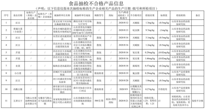 根據(jù)《中華人民共和國(guó)食品安全法》及其實(shí)施條例等有關(guān)規(guī)定和山東省食品安全監(jiān)督抽檢計(jì)劃安排,為進(jìn)一步保障食品安全,省市場(chǎng)監(jiān)管局對(duì)餐飲食品、淀粉及淀粉制品、豆制品、方便食品、蜂產(chǎn)品、糕點(diǎn)、酒類、可可及焙烤咖啡產(chǎn)品、肉制品、食用農(nóng)產(chǎn)品、薯類和膨化食品、水產(chǎn)制品和水果制品共13大類食品862批次樣品進(jìn)行了監(jiān)督抽檢,其中餐飲食品、豆制品、蜂產(chǎn)品、糕點(diǎn)、酒類、肉制品、食用農(nóng)產(chǎn)品7大類食品21批次樣品不合格,檢出了農(nóng)獸藥殘留超標(biāo)、食品添加劑超范圍、超限量使用、微生物污染、質(zhì)量指標(biāo)不達(dá)標(biāo)、重金屬污染等問(wèn)題。